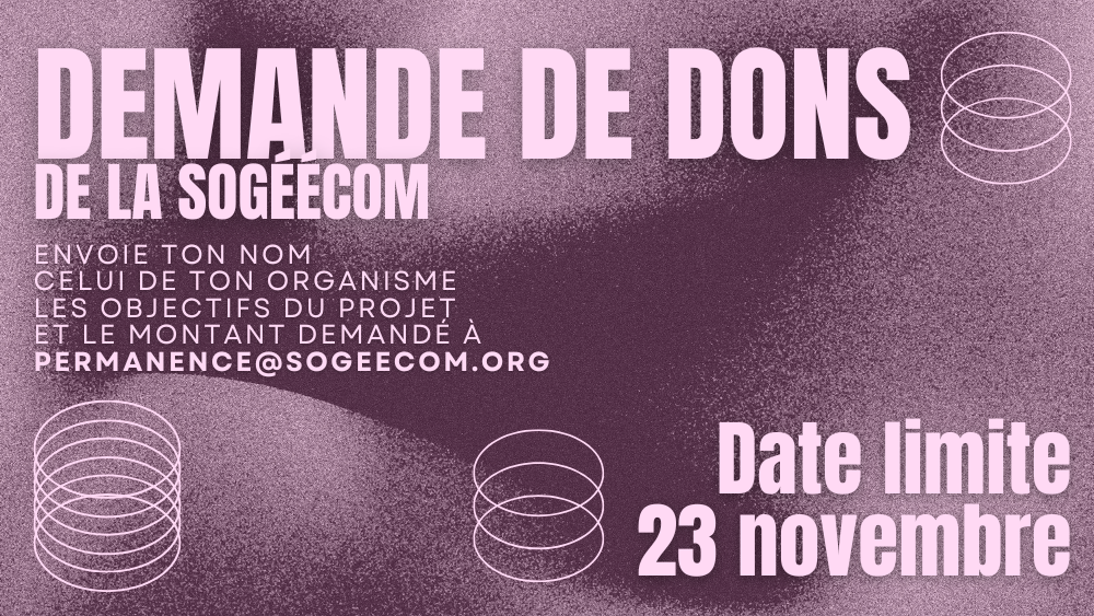 Envoie ton nom et/ou celui de ton organisme, les objectifs du projet et le montant demandé à permanence@sogeecom.org d’ici le 23 novembre prochain!