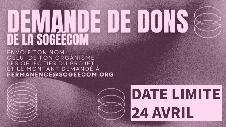 Envoie ton nom et/ou celui de ton organisme, les objectifs du projet et le montant demandé à permanence@sogeecom.org d’ici le 24 avril prochain!